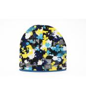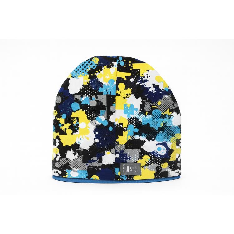 Miękka, elastyczna czapka typu beanie z energetycznym printem (żółcie, błękity, czerń i szarości). Dobrze układa się na główce, nie uciska i mieści się pod kapturem. Na froncie dyskretna metka Ul&Ka. Wnętrze gładkie w niebieskim odcieniu – przyjemne dla skóry.