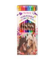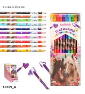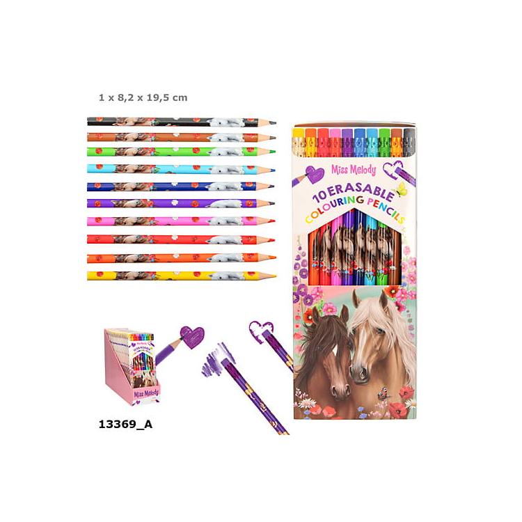 Zmazywalne kredki ołówkowe Miss Melody z motywem koni. Zestaw 10 intensywnych kolorów, każda kredka z dopasowaną gumką na końcu. Zapakowane w poręczne, wysuwane pudełko kartonowe. Idealne dla dzieci od 5 roku życia – do szkoły, domu i kreatywnych zabaw.