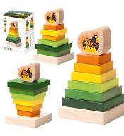 Kolorowa mini-piramidka: drewniana podstawa + 7 klocków do nakładania (razem 8 elementów). Mały format (ok. 13×9×9 cm), dla maluchów 1+ / 18 m+. Produkcja: Ukraina; farby wodne.