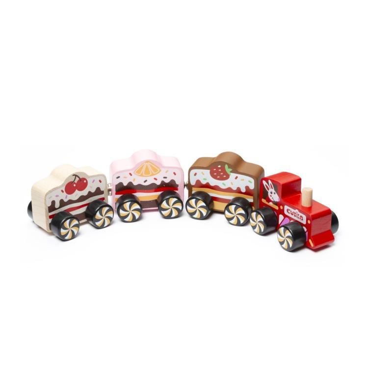 Cubika „Cakes” to uroczy, drewniany pociąg inspirowany słodkościami. Lokomotywa oraz trzy wagoniki łączą się magnetycznie, więc dziecko szybko złoży zestaw i wyruszy „w trasę”.
