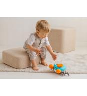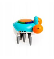 Tak wiele funkcji zamkniętych w tak niewielkiej, uroczej skorupie! Ten zabawny krabik rozweseli na wiele sposobów, łącząc w sobie walory edukacyjne oraz rozrywkowe. Zabawka posiada dwa tryby działania, statyczny oraz dynamiczny, a w ramach każdego z tych trybów potrafi działać z dźwiękiem lub bez. W trybie dynamicznym krab szybciutko porusza się na boki, a czujniki przeszkody, pomagają mu uniknąć stłuczki. W trybie statycznym zabawka wyświetla na skorupie różne kształty, literki lub cyferki, w zależności od wybranej kategorii edukacyjnych treści, którą aktywujemy, poprzez naciśnięcie jednego z kolorowych przycisków okalających wyświetlacz na skorupie. Zabawka mówi w języku polskim oraz angielskim, a za wybór języka odpowiada przełącznik, znajdujący się z boku kraba.