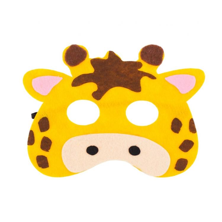 Lekka maska karnawałowa z filcu w kształcie żyrafy. Rozmiar ok. 18×14 cm, elastyczna gumka, wygodne dopasowanie do twarzy dziecka. Idealna na bale przebierańców, teatrzyki i zabawy w przedszkolu.