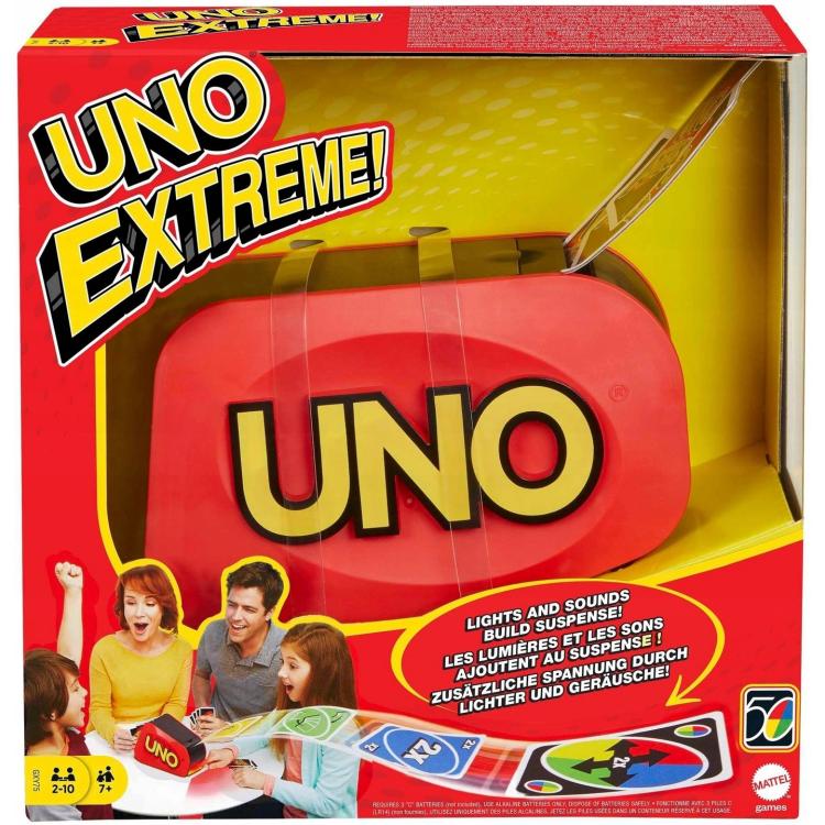 "UNO Extreme!" to popularna gra karciana, jednak wydana w nieco bardziej wciągającej i emocjonującej odsłonie Jest przeznaczona dla dowolnej liczby graczy w wieku powyżej 7 lat. W pudełku znajduje się talia kart znanych z tradycyjnej wersji "UNO" i kilka dodatkowych komponentów. Tym najważniejszym jest niewielka wyrzutnia, wyposażona w funkcję podrzucania kart oraz efekty świetlne i dźwiękowe, której zadanie polega na wprowadzeniu do gry elementu niespodzianki.