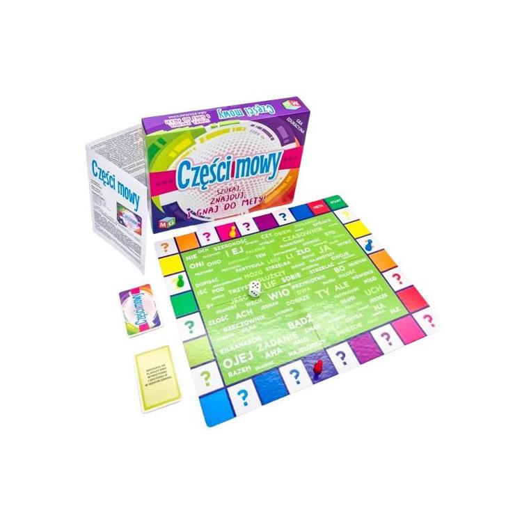 Gra planszowa, która uczy rozpoznawania części mowy (rzeczowniki, czasowniki, przymiotniki itp.). Proste zasady, dużo przykładów, idealna do nauki przez zabawę w domu i w szkole. Wiek: 9+, od 2 graczy.