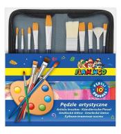 Zestaw pędzli artystycznych z włosiem syntetycznym. Idealnie nadają się do bardzo precyzyjnego malowania. Gwarantują niezwykłą precyzję, przydatną przy kreowaniu wszelkiego rodzaju niewielkich detali i wykończeń. Idealne do zastosowań szkolnych, domowych oraz dla artystów na każdym poziomie zaawansowania. Doskonale nadają się do farb olejnych, akrylowych, akwarelowych, gwaszy oraz farb do tkanin. Wytrzymałe drewniane uchwyty z oznaczeniem grubości pędzla. Różne końcówki i grubości włosia: okrągła NR 5/0, płaska NR 1/4, płaska grzebieniowa NR 3/8, zaokrąglona skośna NR 3/8, płaska wachlarzowa NR 2, gąbkowa ścięta wymiar 25x50 mm. Pakowane w blister.