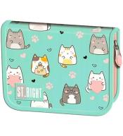 Piórnik zawiera dwie zapinane na suwak kieszenie wyściełane delikatną podszewką. Suwak ozdobiony zawieszką w stylu antycznego mosiądzu w kształcie strzałki. Zmieszczą się w nim zarówno ołówki i długopisy, a także przybory do szycia czy inne drobiazgi. Wykonany ze szczególną dbałością. Ozdobiony logiem Santoro na gumowanej wypukłej strzałce. Wspaniały prezent do szkoły lub pracy.