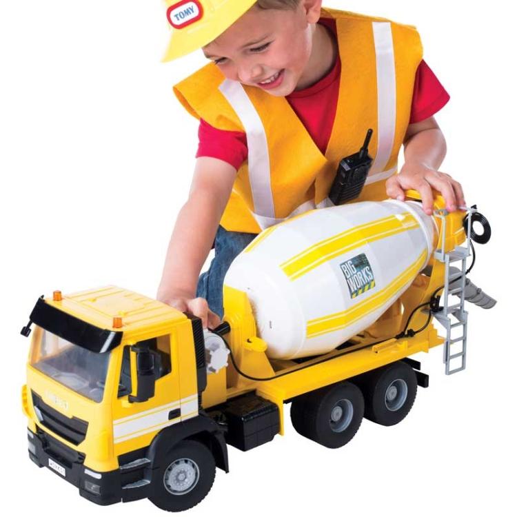 Solidna ciężarówka betoniarka BIG WORKS Iveco Cement Mixer 1:16 w skali 1:16 od Tomy/Britains. Obracający się bęben, efekt dźwiękowy i świetlny, otwierane drzwi, składane lusterka. Idealny prezent dla małych fanów pojazdów od 3 lat.