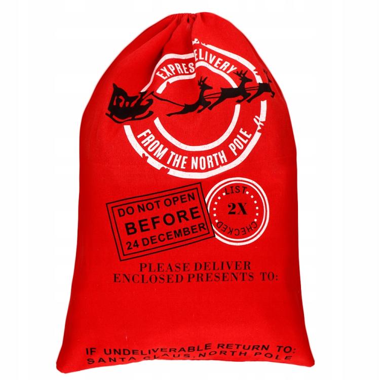 Duży, czerwony worek Mikołaja z nadrukiem, wykonany z wytrzymałej tkaniny. Ściągany sznurkiem u góry – idealny do pakowania prezentów i jako świąteczna dekoracja. Sprawdzi się w domu, przedszkolu i szkole.